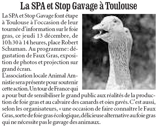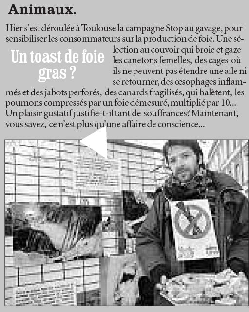 Articles La Dépêche du Midi (étape Toulouse) Article du Vendredi 14 décembre 2007 Paru 12 décembre 2007, page 25, édition Toulouse. Paru 14 décembre 2007, page 25, édition Toulouse. Tour contre le foie gras 2007