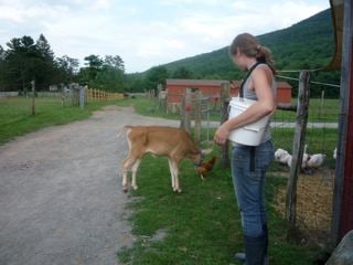 Marybeth adore les câlins. Elle veut téter aussi. On me donne la permission de rentrer dans son box pour la câliner. Comme tous les bébés, elle a besoin de compagnie et de tendresse. Elle me lèche inlassablement les bras avec concentration. Sa langue est rugueuse, plus efficace qu’un gommage ! Je lui donne un seau de lait dans lequel elle donne de grands coups de tête, comme elle le ferait si elle pouvait téter sa mère… C’est bouleversant et sportif de lui tenir le seau de lait. Je me sens très privilégiée.