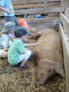 Environ quatre cents animaux vivent ici. Des chèvres, des moutons, des cochons, des poules et des coqs, des canards, des dindons, des lapins, des vaches, une mule. Il y a aussi des chiens et des chats. Tous sont amicaux et curieux.