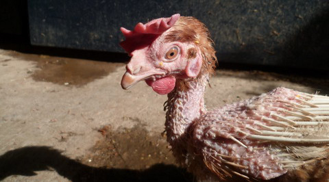 Une poule après un an de ponte en élevage