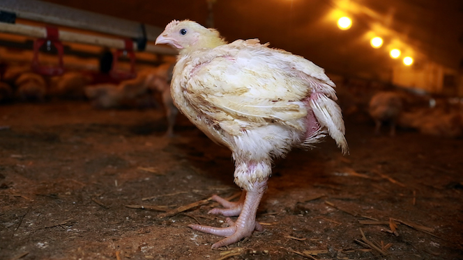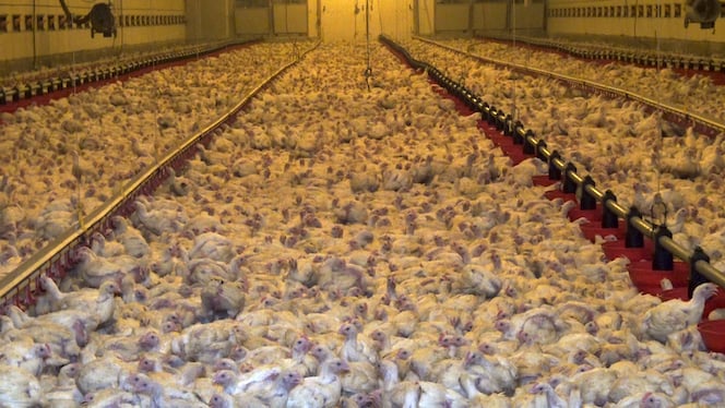 En grandissant, les anciens compagnons de Géo rempliront très vite tout l’espace du hangar. L’air y deviendra vite difficilement respirable à cause de la poussière, des odeurs d’ammoniac et de la présence de dioxyde de carbone. Chaque année, des millions de poulets meurent du fait des conditions d’élevage insalubres.