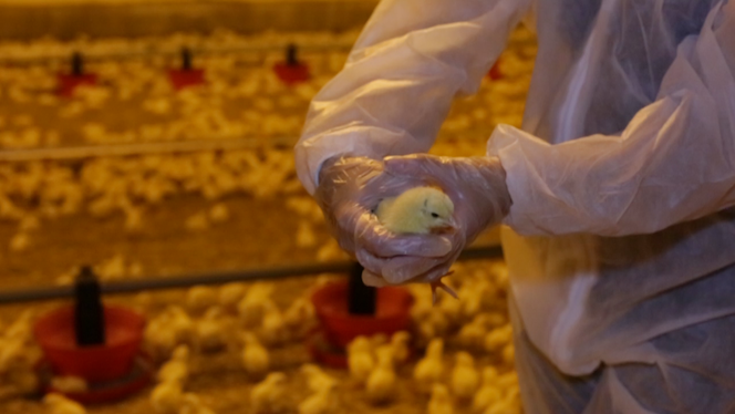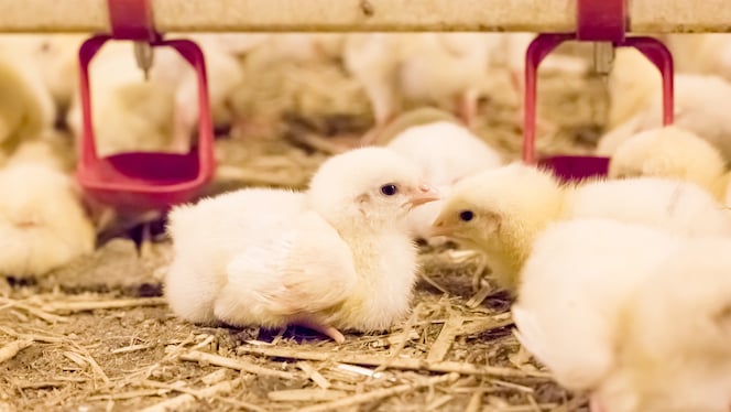 Notre poussin tient le coup : bien que sonné, il est toujours en vie lorsqu’un humain décharge sa caisse. Il se trouve alors projeté dans un hangar immense. La lumière est éblouissante et la litière est propre… pour le moment. Dans un mois, elle sera sale et humide : les bactéries y pulluleront et les jeunes animaux développeront des maladies de peau à son contact.