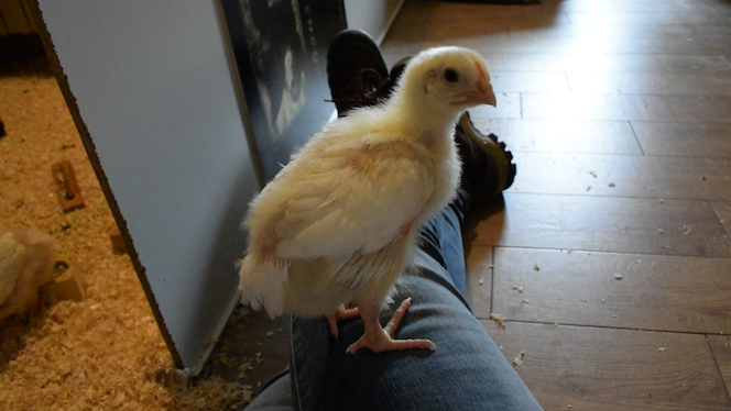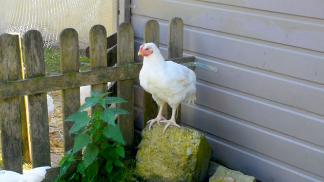Géo, lui, est en bonne santé. Mais il a été sauvé juste à temps : quelques jours de plus dans ce hangar et les conséquences sur sa santé auraient été irrémédiables. En effet, la nourriture mise à disposition en élevage intensif est conçue pour faire prendre du poids très rapidement aux animaux, si rapidement que nombre de poulets ont du mal à se tenir debout. Ils grossissent tellement vite que leurs pattes ne parviennent plus à supporter leur propre poids. Une tête de poussin sur un corps de poulet.